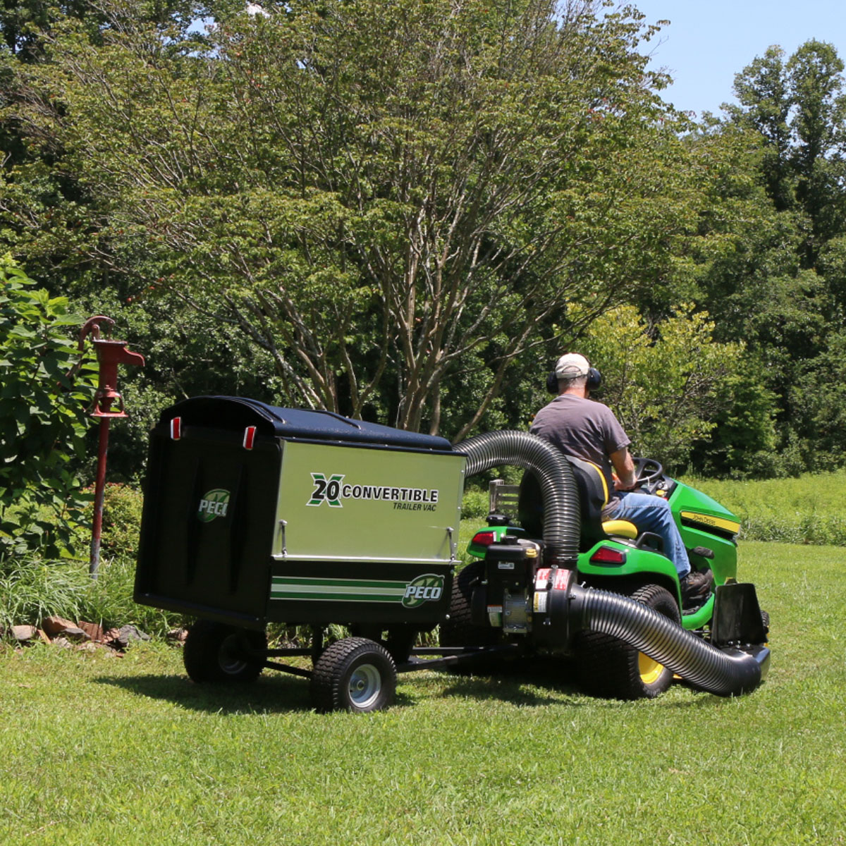 The PECO X20 Convertible Trailer Vac is rugged, lightweight vacuum system that fits practically any lawn tractor or zero-turn mower. It is the perfect solution for residential or light commercial use. Its tapered bed allows easy dumping and quickly converts to a dump cart for year round versatility.